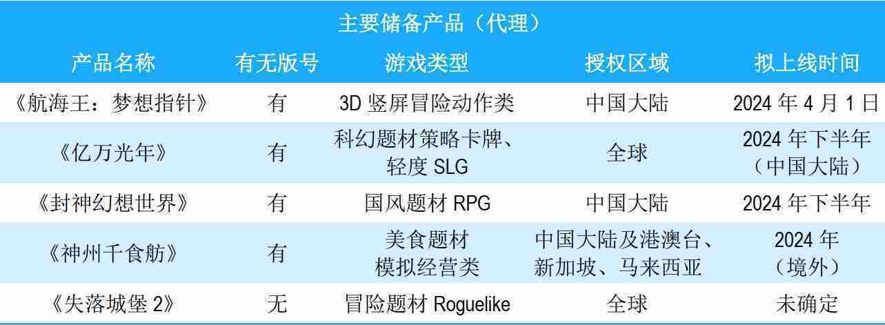公司储备的多个自研、、、代理产品都在有序推进当中,,涵盖放置类、、策略类、、、、模拟经营类、、RPG、、、、Roguelike等多元化游戏品类,,,,储备的主要自研和代理产品如下::::